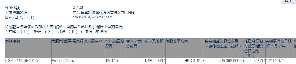 智通财经APP获悉,香港联交所最新资料显示,11月16日,Prudential plc减持中远海能(01138)143.6万股,每股作价3.1207港元,总金额约为448.13万港元。减持后最新持股数目为9030.8万股,最新持股比例为6.96%。