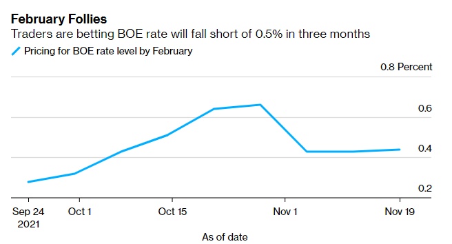 明年2月份的情况也备受关注。最大的问题是,届时英国央行货币政策委员会是否会将借贷成本提高到0.5%——超过0.5%的门槛后,政策制定者可能会让其8750亿英镑(1.2万亿美元)资产购买计划中的英国国债到期后不再以新债取代。这也可能决定央行是否将2022年3月到期的280亿英镑英国国债进行再投资。如果选择不进行再投资,将有助于英国央行收紧政策,并遏制已经达到接近十年来最高水平的通胀。上周五,货币市场押注关键利率将比这一水平低约9个基点。