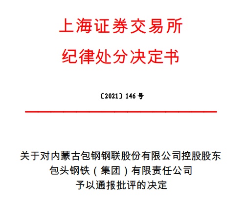 上交所对包钢股份控股股东包钢集团予以通报批评,对于上述纪律处分,上交所将通报中国证监会,并记入上市公司诚信档案。