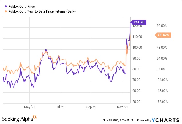不过,Roblox在6月15日发布报告称,其5月份活跃用户和他们在游戏平台上的支出均有所下降;这导致市场认为该平台的增长正在放缓,该股股价因此下跌了8%,此后便一直处在70美元-90美元区间。而在11月9日公布了强劲的第三季度业绩之后,该股又再度飙升42%。在11月16日的投资者之后,投资者对Roblox关于未来举措的乐观情绪进一步推动该股走高。