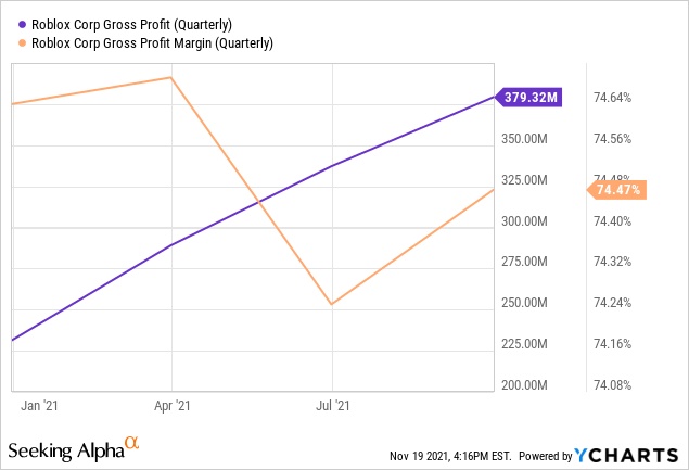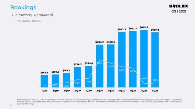 Roblox第三季度预订量为6.378亿美元,同比增长28%。对该公司而言,预订量是一个比营收增长更为重要的指标。该公司预计,10月份的预订量在1.77亿美元至1.79亿美元之间,同比增长30%-40%,这表明第四季度该指标的表现可能也会更好。