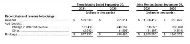 下图则展示了营收和预订量之间的关系,这能够让投资者更好地了解营收、递延营收和预订量之间的关系。