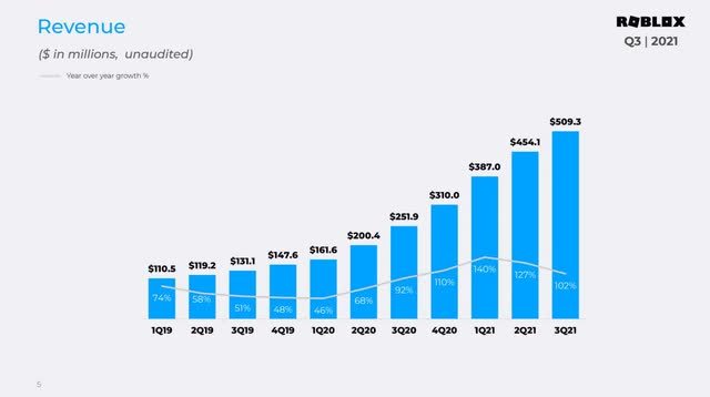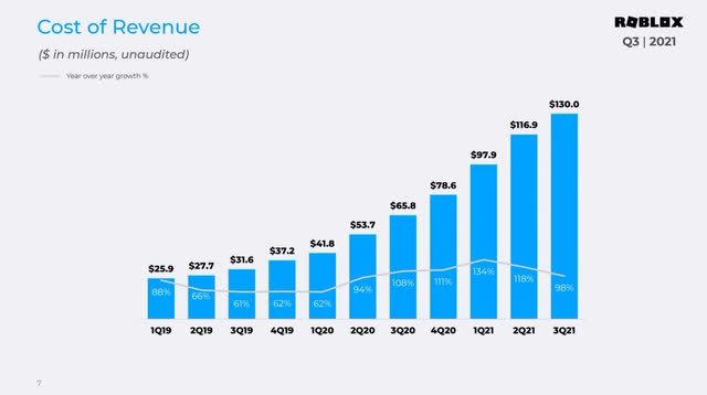 Roblox曾在10月底遭遇了约70小时的宕机,造成了2500万美元的预订量损失,另外还支付了680万美元的开发商赔偿金。在此之前,10月份日均用户数为5050万,比2020年同期增长43%;用户参与时长为32亿小时,同比增长41%。这些数据表明,假如不发生此类宕机事故,该平台第四季度的用户数据可能会更加强劲。