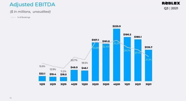不断增长的用户粘性给Roblox带来了5.09亿美元的三季度营收,同比增长了102%;调整后的息税折旧摊销前利润(EBITDA)则为1.36亿美元。