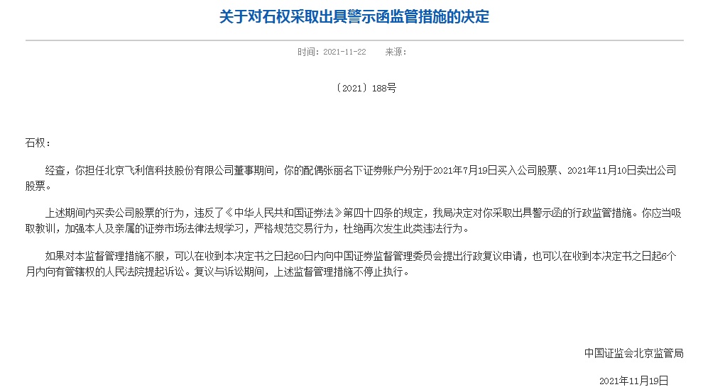 智通财经APP获悉,据北京证监局11月22日消息,北京证监局对石权出具警示函。经查,石权担任北京飞利信科技股份有限公司(300287.SZ)董事期间,其配偶张丽名下证券账户分别于2021年7月19日买入公司股票、2021年11月10日卖出公司股票。上述期间内买卖公司股票的行为构成违规,北京证监局决定对石权采取出具警示函的行政监管措施。