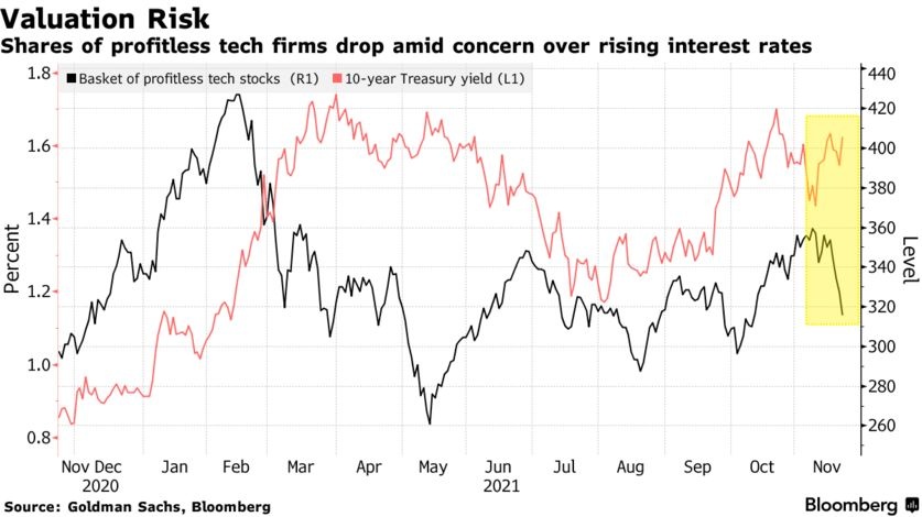 直到最近,尚未盈利的情况还未能阻止投资者押注低利率将证明科技等高价股的估值是合理的。如今,在美国总统拜登提名鲍威尔连任美联储主席后,债券市场已开始考虑明年加息的可能性加大,投资者可能正在重新考虑他们的投资组合。