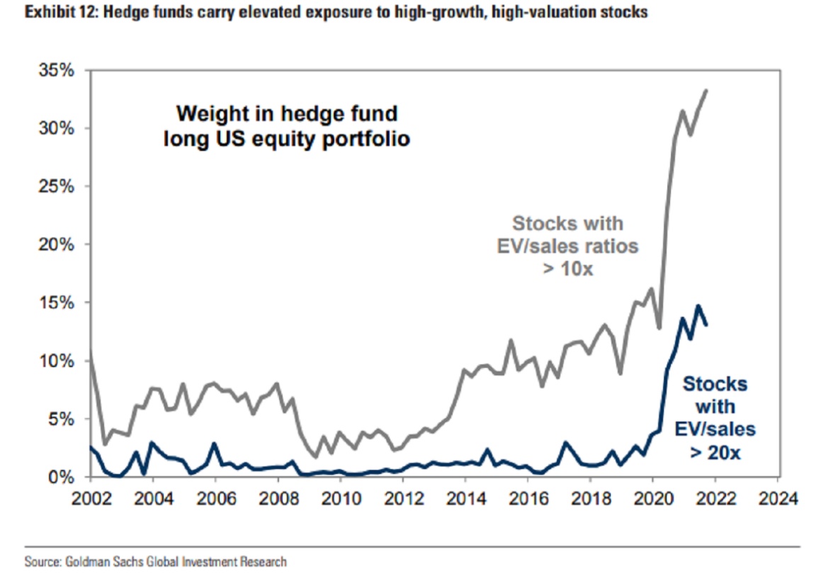 对于刚刚将高增长、高估值股票的敞口提高到极端水平的对冲基金来说,这是个坏消息。根据高盛编制的基金文件数据,第四季度初,企业价值超过销售额 10 倍的公司占对冲基金持股比例的三分之一,至2002年以来的最高水平。
