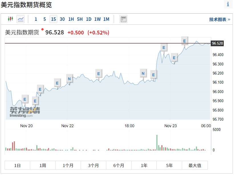此外,美元指数和美国国债收益率盘中拉升,美元刷新上周所创的16个月来盘中高位;各期限美债中短债收益率升幅居前,基准10年期美债和对利率敏感的2年期美债收益率均较上周五的盘中低位回升超过10个基点,十年期美债收益率周一收涨4.42%,报1.627%。截止发稿,美元指数期货涨0.52%,报96.528。