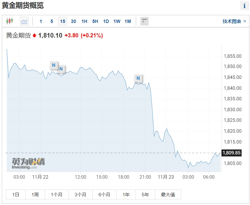 OANDA的Edward Moya称,实际收益率的走高加速了黄金的一些疲软,但并不意味着这一趋势将持续,并认为在12月15日美国联邦公开市场委员会(FOMC)会议之前,黄金的支撑位在1800美元左右,盘整位在1800-1850美元之间。