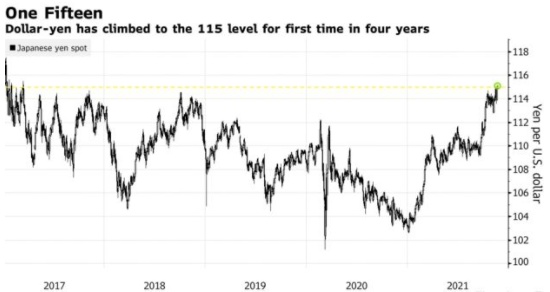 其次,自2017年以来,美元兑日元汇率首次升破关键水平。周二,美元兑日元一度上涨0.2%,至115.14,超过了115的重要心理关口。美国国债收益率隔夜跳升,扩大了与日本国债的利差,提升了美国资产的相对吸引力。