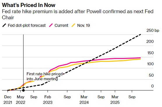 在拜登选择鲍威尔美联储连任后,交易员们正在消化美联储将加速缩减购债规模,以及6月份加息的可能性。