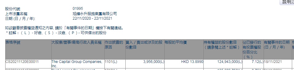 智通财经APP获悉,香港联交所最新资料显示,11月18日,美国资本集团增持旭辉永升服务(01995)395.6万股,每股作价13.8990港元,总金额约为5498.44万港元。增持后最新持股数目约为1.25亿股,最新持股比例为7.12%。