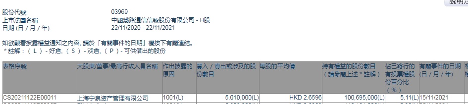 智通财经APP获悉,香港联交所最新资料显示,11月15日,上海宁泉资产管理有限公司增持中国通号(03969)501万股,每股作价2.6596港元,总金额约为1332.46万港元。增持后最新持股数目约为1.00695亿股,最新持股比例为5.11%。