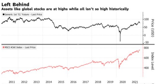 例如,近年来原油价格曾出现过一些大幅下跌,目前仍远低于2011年至2014年的水平。 这与其他许多金融资产形成了鲜明对比,这些资产正处于新高水平,这表明,在央行努力抗击疫情影响之际,油价并未跟上央行资产负债表的增长。