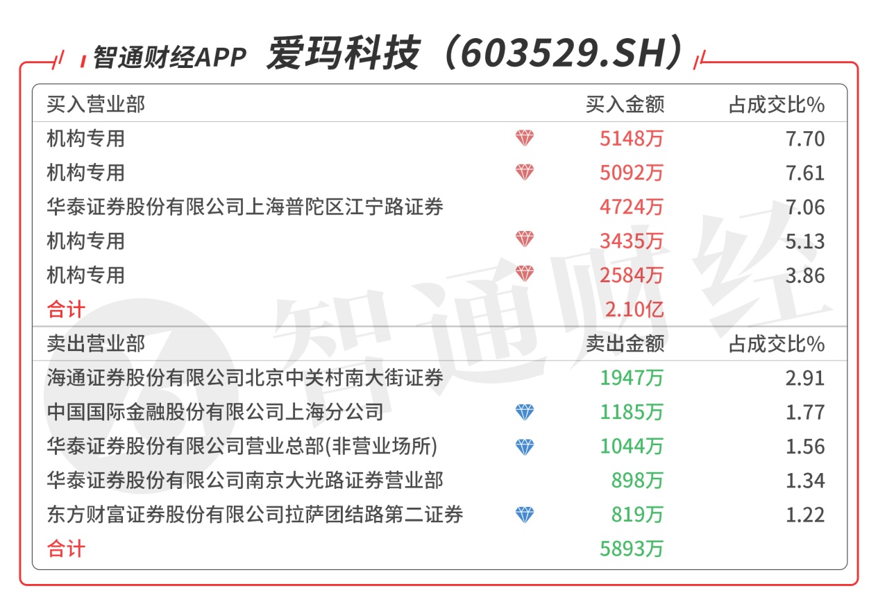 爱玛科技(603529.SH):受到众多机构青睐,今日共四个机构席位出现在龙虎榜单上,分别列买一,买二,买四,买五,合计买入2.1亿元,买三是知名游资的席位买入4724万元,当日净买入1.51亿元,该股底部横盘缩量,今日放量涨停,预计有溢价。