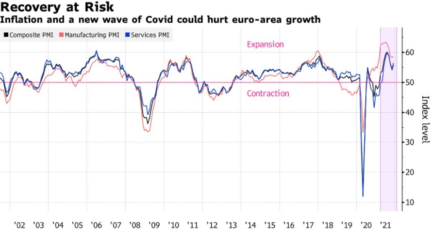 但IHS Markit报告称,欧元区2021年最后一个季度的经济增长将更加疲软。这在一定程度上归因于最新一波新冠疫情在欧洲爆发,这似乎将在12月对经济造成新的破坏。任何新的封锁都可能打击目前蓬勃发展的服务业,而制造业已经受到全球供应紧缩的影响。