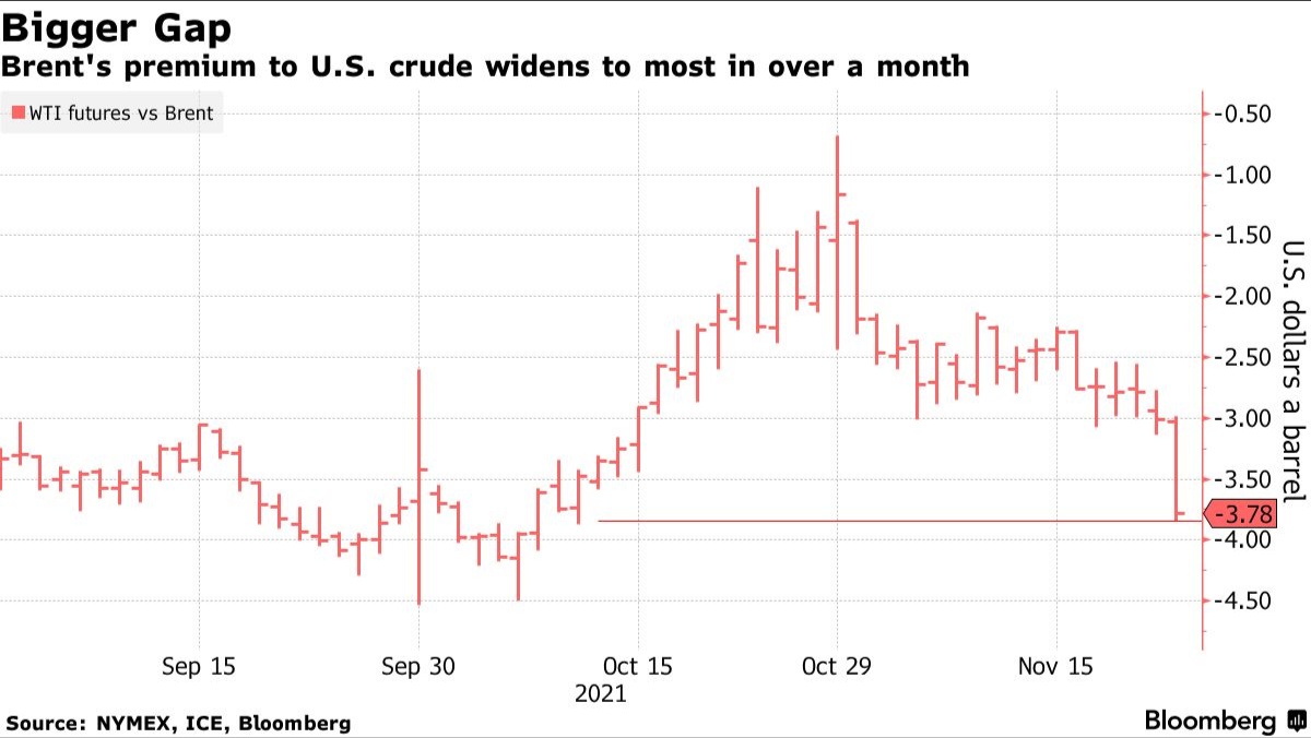因此,在白宫宣布将与其他国家一起释放战略石油储备后的数小时内,布伦特原油相对美国原油期货的溢价攀升至六周高位。这意味着通常依赖进口的美国需求中心可能不得不为原油支付更高的价格,尽管这是暂时的,但也可能会导致汽油价格上涨。