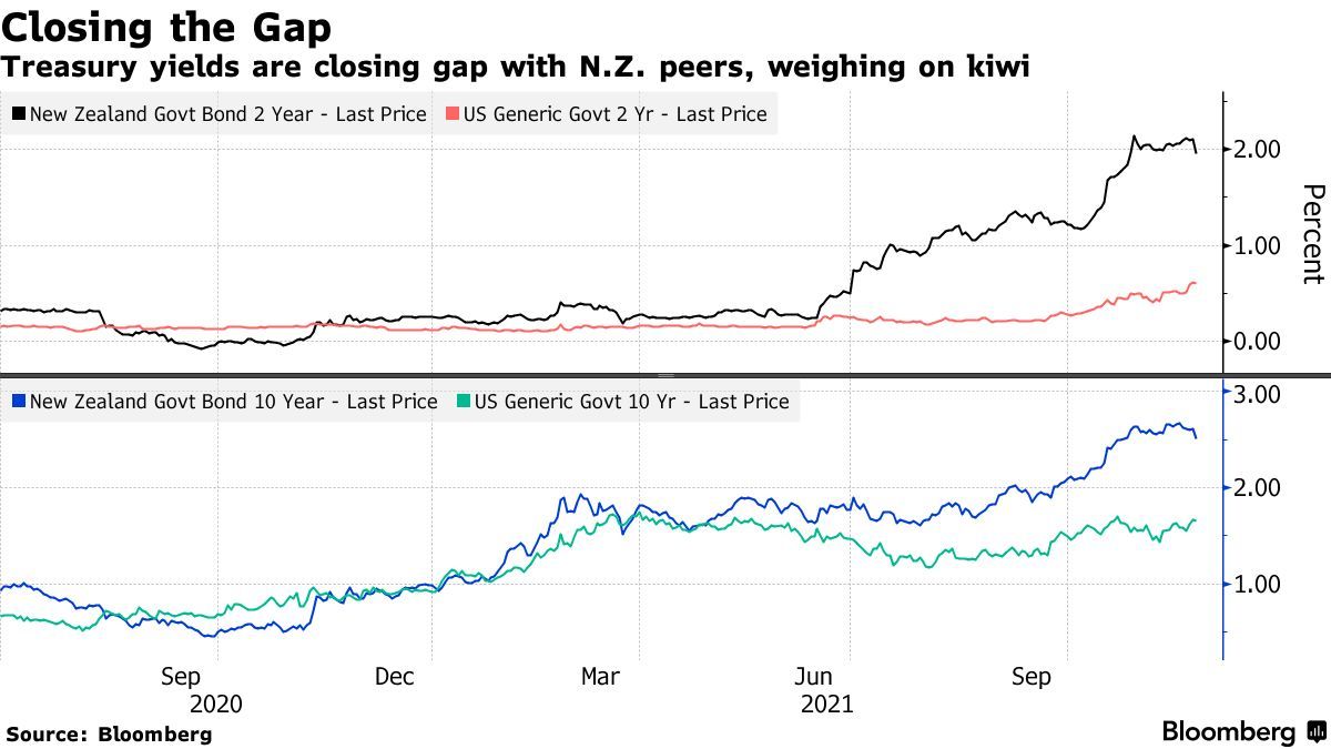 利率决议公布后,新西兰两年期国债收益率一度下跌14个基点至1.96%,10年期国债收益率下跌11个基点至2.50%,为3月以来最大跌幅。新西兰国债收益率与美国国债收益率之间的差值也开始缩减,同时收益率之间差值暗示,如果美联储加息进程快于市场预期,新西兰元可能会加速贬值。