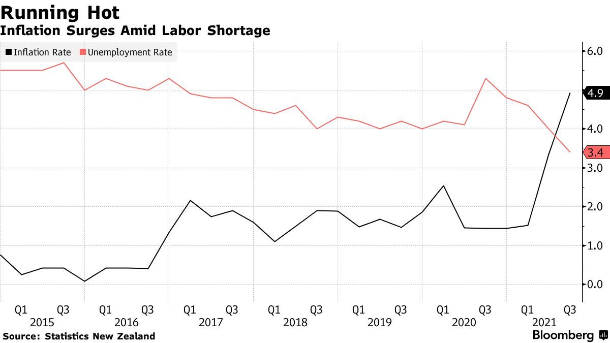 在新西兰,由于劳动力短缺,工资水平开始被抬高,叠加供应链中断等负面影响,价格压力正变得更加广泛和持久。新西兰联储表示:“油价上涨、运输成本上升和供应链中断等因素带来的影响,加剧了通胀率短期上行。”“鉴于目前国内产能有限,当前面临的相对价格冲击有可能导致更普遍的价格上涨。”