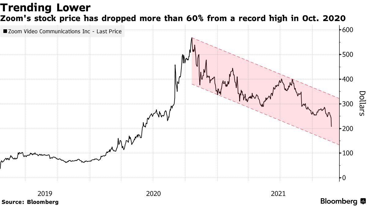 Zoom的市值自2020年10月达到峰值以来蒸发了约1000亿美元,股价下跌了64%。尽管经过回调,但该股自2019年上市以来仍上涨了近500%。