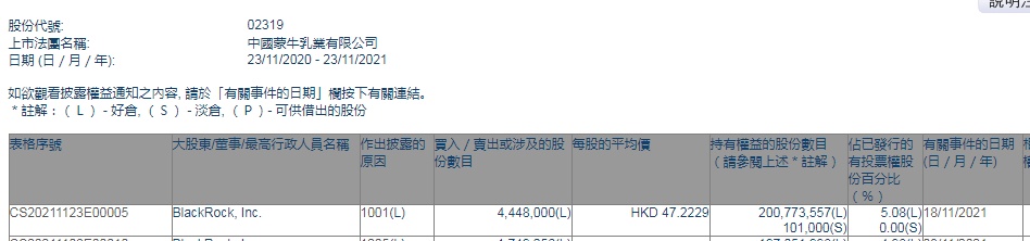 智通财经APP获悉,香港联交所最新资料显示,11月18日,贝莱德BlackRock, Inc.增持蒙牛乳业(02319)444.8万股,每股作价47.2229港元,总金额约为2.10亿港元。增持后最新持股数目约为2.01亿股,最新持股比例为5.08%。