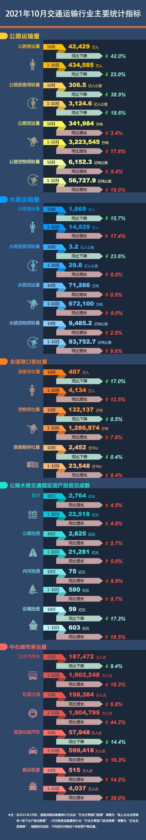 智通财经APP获悉,11月24日,交通运输部发布2021年10月交通运输行业主要统计指标。数据显示,10月份全国港口货物吞吐量132,137万吨,同比下降0.5%;集装箱吞吐量达2,452万TEU,同比下降0.4%。1-10月,货物吞吐量达1,286,974万吨,同比增长7.8%;集装箱吞吐量达23,548万TEU,同比增长8.4%。
