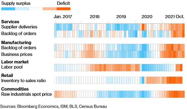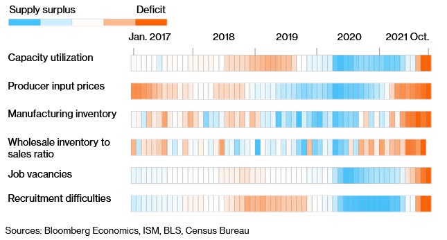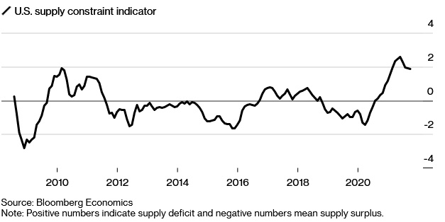 美国供应限制指标虽然仍处于历史高位,但在10月份有所下降,这表明供应短缺的情况正在变得不那么严重。