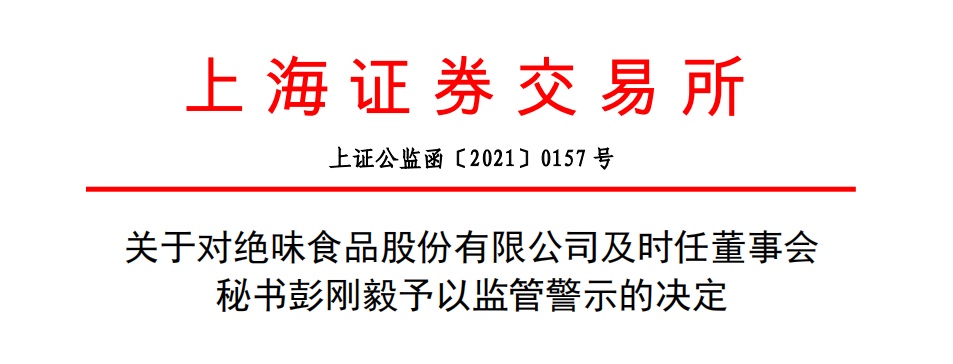 智通财经APP获悉,11月24日,上交所向绝味食品股份有限公司(绝味食品,603517.SH)及时任董事会秘书彭刚毅予以监管警示。经查明,绝味食品签订股权转让协议所产生的净利润已达到披露标准,但公司未按规定及时予以公告,也未按照公司章程的规定及时提交董事会审议,公司上述行为违反规定。时任董事会秘书彭刚毅(任期自2018年12月24日至今)作为公司信息披露事务的具体负责人,未能勤勉尽责,对公司违规行为负有责任,其行为违反规定。