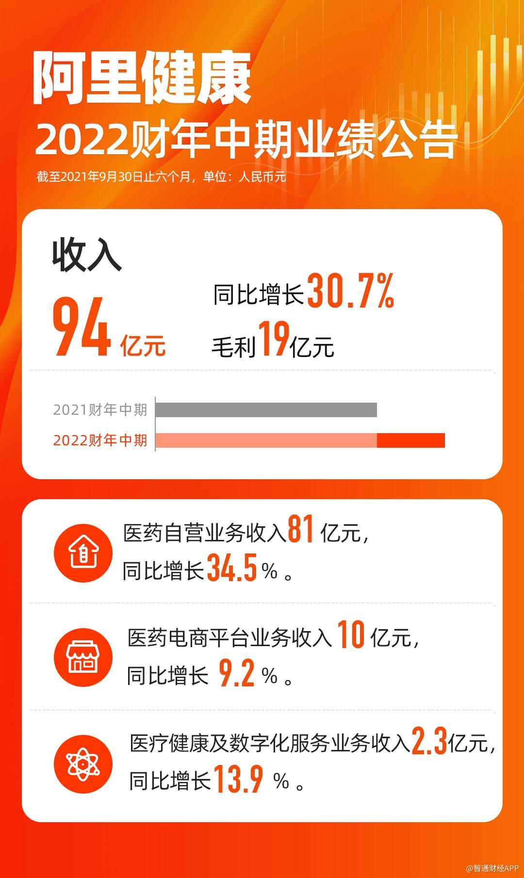 智通财经APP获悉,11月24日晚间,阿里健康(00241)发布2022财年中期业绩公告:截至2021年9月30日止六个月,阿里健康收入93.6亿元人民币,同比增长30.7%;毛利18.7亿元。公告显示,阿里健康在积极响应国家号召和引领,维持行业内较高质控水位的同时,各项业务继续保持稳健的增长。
