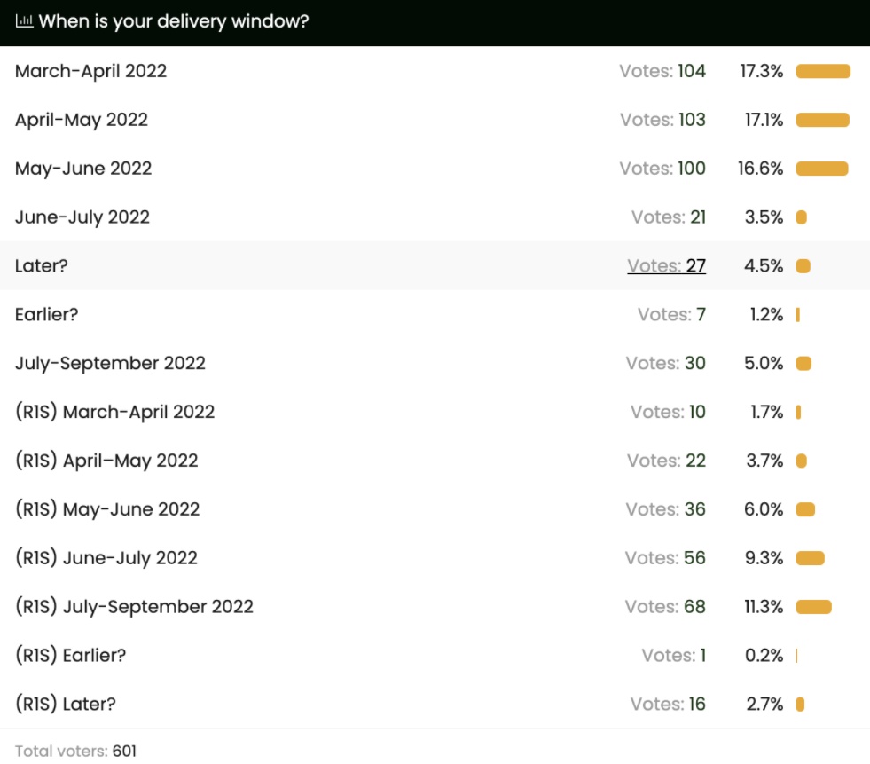 以下是通过Rivian论坛上的非正式民意调查得出的R1S SUV预计交付时间细分结果: