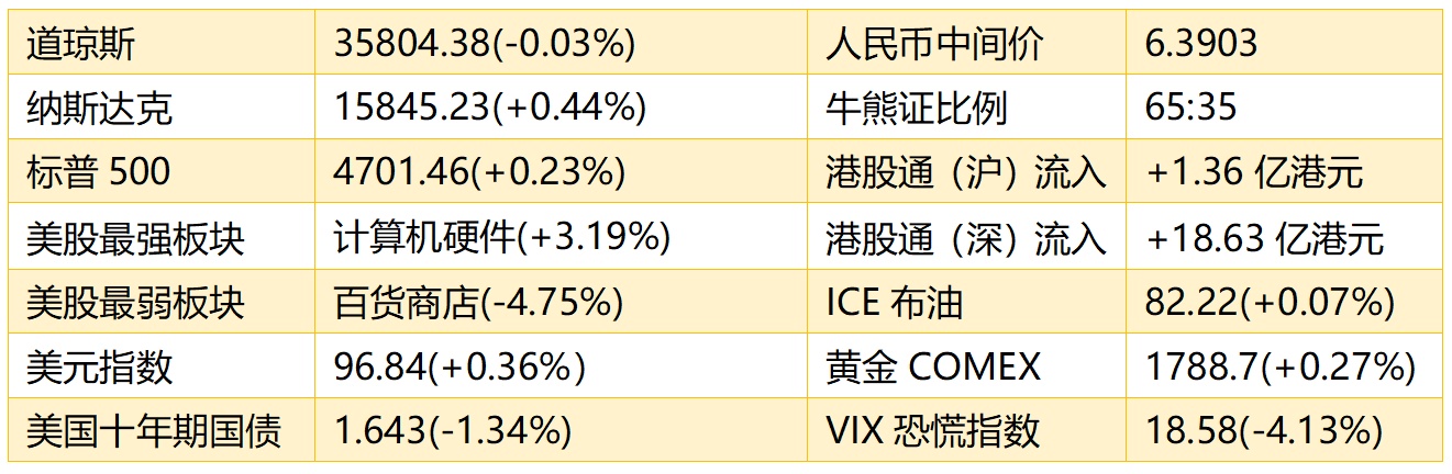 1、 隔夜美股截至收盘,道指跌9.42点或0.03%,报35804.38点;纳指涨70.09点或0.44%,报15845.23点;标普500指数涨10.76点或0.23%,报4701.46点。港股ADR指数下跌,按比例计算,收报24667点,跌18.25点或0.07%。