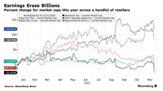据了解,诺德斯特龙和Gap在早前公布的财报中均表示,供应链紧张对业绩产生了负面影响,市场将此解读为公司未做好充分准备,生意被提前储备库存的竞品蚕食;百思买虽然公布了营收优于预期的三季报,但由于大范围的盗窃导致其一项盈利指标下降,市场对此表示担忧,股价随即暴跌。