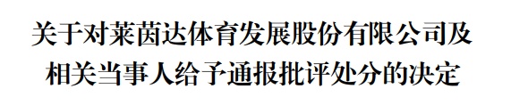 深交所对莱茵体育及相关当事人作出如下处分:一、对莱茵达体育发展股份有限公司给予通报批评的处分;二、对莱茵达体育发展股份有限公司时任董事长高继胜、时任总经理刘晓亮、时任副总经理兼财务总监徐兰芝、时任董事会秘书李钢孟给予通报批评的处分。