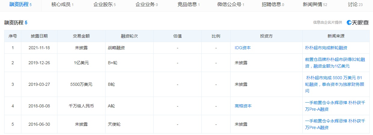 智通财经APP获悉,天眼查APP显示,朴朴超市获得新一轮战略融资,投资方为IDG资本,融资金额未透露。天眼查融资历程显示,该公司自2016年6月以来有5轮融资记录,融资方涉及高榕资本、IDG资本等。据公开资料显示,朴朴超市是一家30分钟即时配送的移动互联网购物平台。品类包含:水果蔬菜、肉禽蛋奶、粮油调味、酒水饮料、休闲食品、个人护理、化妆品、清洁用品、日用百货等。