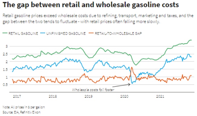 拜登在谈到从战略储备中释放石油时表示,如果汽油批发和零售价之间的差距与过去的平均水平一致,现在美国人每加仑油价应该比现在低25美分左右。其中拜登指的是粗制汽油期货价格(称为RBOB汽油期货)与零售价格之间的差距,随着RBOB汽油期货在过去几周下跌,而零售成本保持相对稳定,这一差距已经扩大。