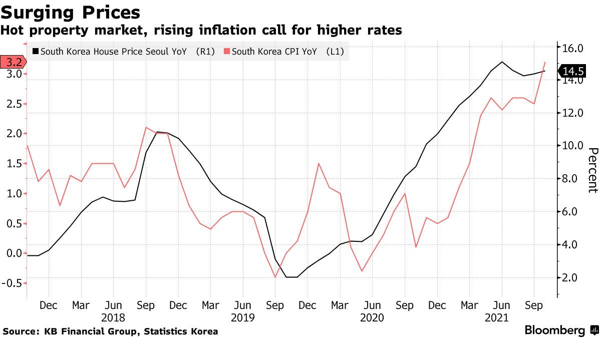 智通财经APP获悉,韩国央行今日宣布将目前的基准利率由0.75%上调25个基点至1%,这是韩国央行自今年8月以来第二次加息,并暗示将进一步削减刺激措施,以避免出现资产泡沫,防止通胀进一步加剧,这意味着韩国为期1年零8个月的“超低利率时代”落幕。