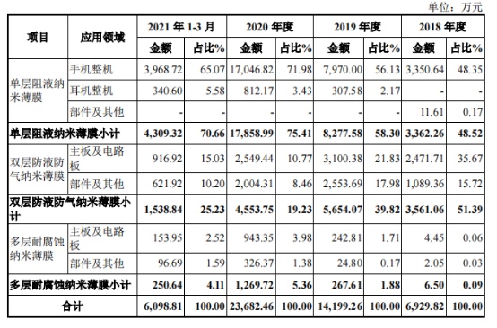 其中,单层阻液纳米薄膜能使产品表面达到疏水、疏油的效果,主要应用于手机、耳机、耳机充电盒等电子产品的防水阻液。2018年、2019年、2020年全年及2021年3月31日止三个月,单层阻液纳米薄膜产品分别实现收入3362.26万元、8277.58万元、1.79亿元、4309.32万元,占期内总收入的48.52%、58.30%、75.41%、70.66%。而分应用领域来看,单层阻液纳米薄膜业务的核心收入来自于手机整机板块。于报告期内,公司来自该应用领域的营收占比分别为48.35%、56.13%、71.98%及65.07%。
