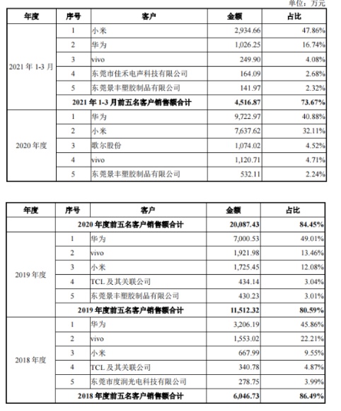 据招股书表述,2018年、2019年、2020年全年及2021年3月31日止三个月,来自前五大客户的销售收入占当期营业收入的比重分别为 86.49%、80.59%、84.45%和 73.67%。其中,来自华为和小米的合计营业收入占当期营业收入比重分别为 55.41%、61.09%、72.99%和 64.60%。