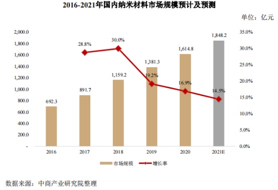 其中,纳米材料因其不同于传统材料的特殊性质,在光学、机械、磁学、电子、化学和生物学等各个领域有着广阔的应用前景。公司制备的纳米薄膜即为一种二维纳米材料。纳米薄膜最早用于实现电路板与电子元器件的防水功能,随着相关技术的不断进步,其防护性能、光学性能、导电性能、信号通过率等技术指标均在持续改善。纳米薄膜已在以智能手机为代表的消费电子整机及元器件产业链中得到广泛应用,实现了对相关应用场景的深度覆盖。近年来随着中国综合实力的不断增强、国民经济各领域稳定发展,国内纳米薄膜产业链日趋完善。根据中商产业研究院数据,中国纳米材料产业规模已由 2016 年的 692.3亿元增至 2020 年的 1,614.8 亿元,年均复合增长率为 23.58%,预计 2021 年中国纳米材料市场规模可达 1,848.2 亿元。