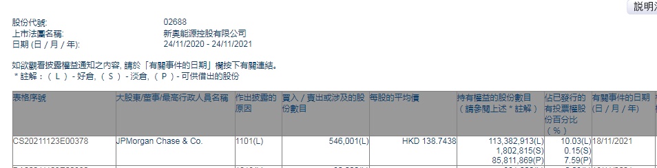 智通财经APP获悉,香港联交所最新资料显示,11月18日,小摩增持新奥能源(02688)54.6001万股,每股作价138.7438港元,总金额约为7575.43万港元。增持后最新持股数目约为1.13亿股,最新持股比例为10.03%。