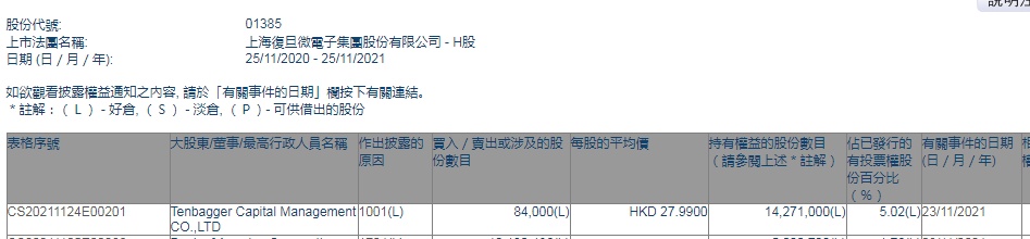 智通财经APP获悉,香港联交所最新资料显示,11月23日,Tenbagger Capital Management CO.,LTD 增持上海复旦(01385)8.4万股,每股作价27.99港元,总金额约为235.12万港元。增持后最新持股数目约为1427.1万股,最新持股比例为5.02%。
