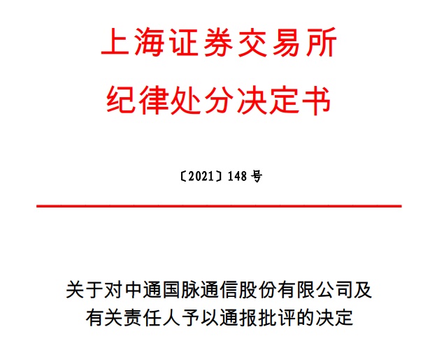 上交所决定:对中通国脉通信股份有限公司及公司时任董事长王世超、时任总经理兼财务总监张显坤、时任总经理张利岩、时任财务总监田国华、时任董事会秘书赵伟平、时任独立董事兼审计委员会召集人王晓明予以通报批评。对于上述纪律处分,上交所将通报中国证监会,并记入上市公司诚信档案。