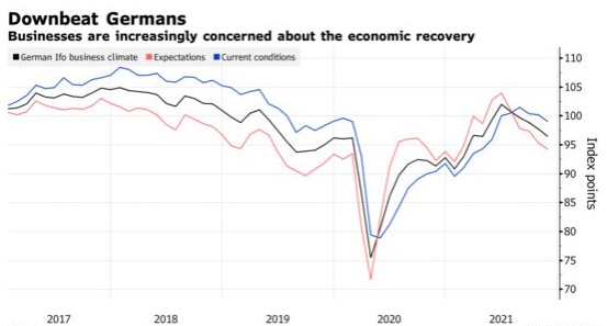 德国央行本周警告称,11月份通胀率可能接近6%,并可能在更长时间内保持高位。新的疫情限制措施可能会对服务业需求造成压力,而服务业一直是经济复苏的重要驱动力。这使得德国商业信心指数在11月再次受到打击。周三,数据显示,德国11月IFO商业景气指数录得96.5,连续第五个月下跌,为4月以来的最低水平。经济学家此前预计该指数将下降至 96.7,且对未来半年的预期也有所恶化。