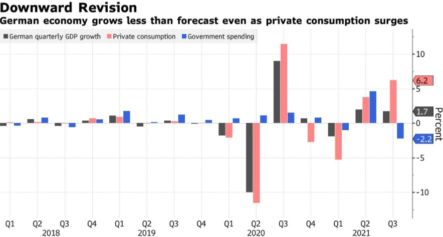 世行集团副总裁分析师Thomas Gitzel称:“这是由于服务业的追赶效应。 餐馆、酒吧和酒店业尤其受益。” 但Gitzel补充称,制造业持续的供应瓶颈阻碍了整体增长,这可以从第三季机器和建筑企业投资活动的减弱中看出来。三季度政府支出也有所下降,进一步压低了整体GDP数据。