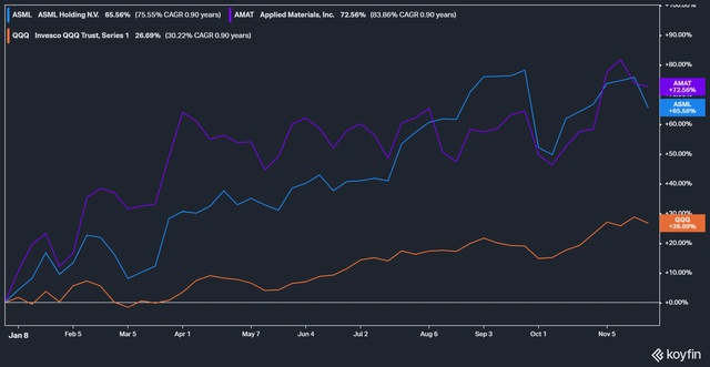 对于阿斯麦的投资者来说,这是令人难以置信的一年。得益于支撑其行业的长期驱动因素,该股全年势头强劲。此外,鉴于其在EUV光刻领域的主导地位,投资者愿意继续支付更高的价格来持有其股份。因此,阿斯麦股票今年迄今的涨幅为65.6%,轻松超过了纳指100ETF(QQQ.US)今年迄今26.7%的回报率。然而,它在WFE的竞争对手应用材料(AMAT.US)的股票略微领先,今年迄今上涨了72.5%。