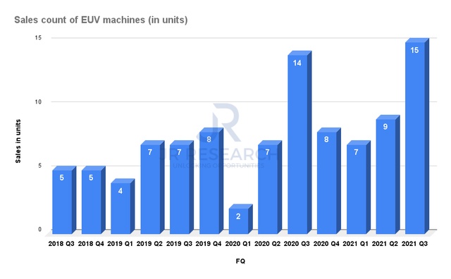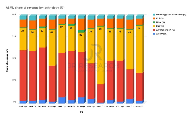 在过去的三年里,EUV极大地推动了阿斯麦的销售。我们可以很容易地从单位销售额的增长速度和EUV的收入份额中得出结论。在第三季度,EUV在营收中的份额仍保持在54%。此外,其代工客户已表示,他们计划进一步增加资本支出强度,以支持强劲的潜在需求。因此,我们认为EUV的收入份额将保持强劲。
