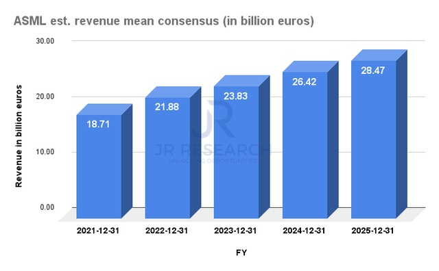 管理层有信心发布2020年至2030年11%年复合增长率的长期指引。管理层还提供了到25财年的收入可见性,预计收入在240亿 - 300亿欧元之间。市场普遍预期收入为285亿欧元,位于阿斯麦中期指导值的高端。因此,市场普遍估计,未来四年的复合年增长率为11.1%,与阿斯麦的长期指引一致。值得注意的是,这也符合Mordor Intelligence对其2020财年的估计。从2020财年到2026财年,阿斯麦预计收入将以15.3%的复合年增长率增长。因此,该公司的收入指引和市场普遍预测是一致且可信的。