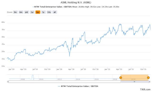 ASML 股票 EV/NTM EBITDA 3 年平均值