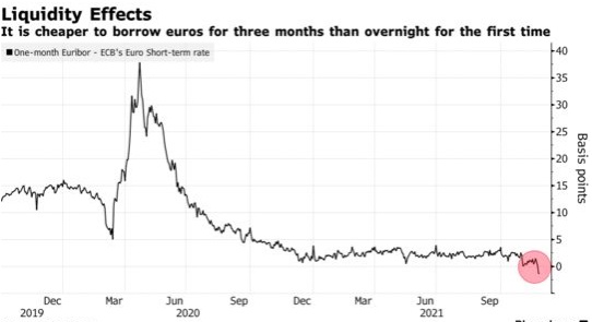 智通财经APP获悉,创新高的现金过剩正在扭曲欧洲货币市场,欧元区银行隔夜拆借利率高于三个月拆借利率。