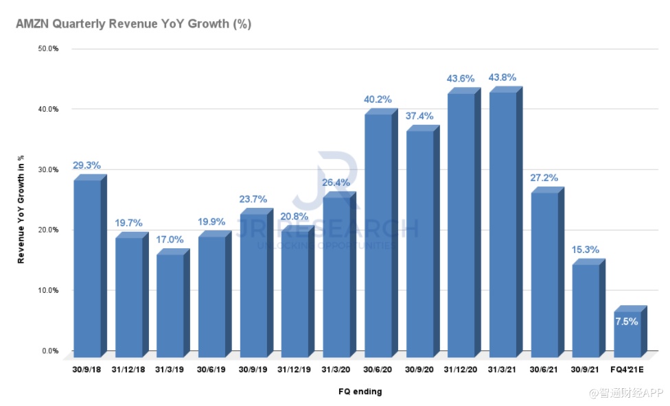 亚马逊Q3业绩令市场意外。同时,15.26%的营收增长率也是过去三年最低的。此外,亚马逊还预测其2021年第四季度营收增长率约为7.5%左右,这将是过去三年同比增幅最低的一次。从这一点来看,亚马逊的前景令人担忧。